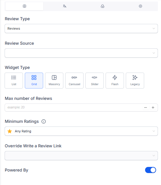 Section titled “Layout Tab: Configuring Widget Structure”In the “Layout” tab, you’ll see several options to customize the basic structure of your review widget:
