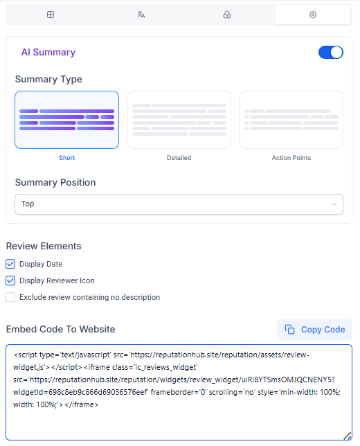 AI review summary: Customize how reviews are summarized and displayed in widgets. Choose from three different summary types: