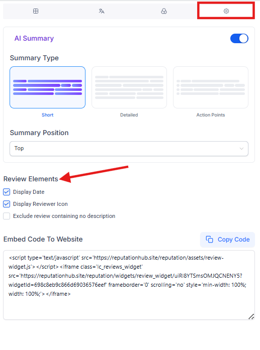 Settings Tab: Customize review elements and embedding.