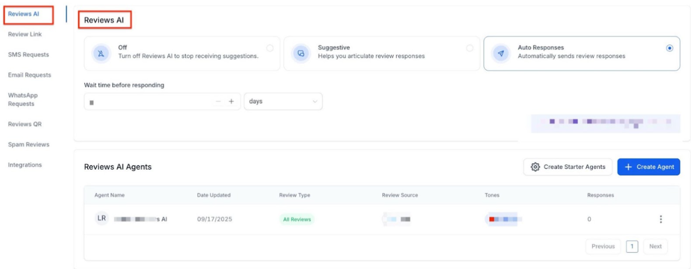 Section titled “Step 1: Access the Reviews AI Settings”To begin, navigate to the Reputation Management area in your account. From there, click on Settings and click the Reviews AI tab. This is where you can create and manage all your AI agents