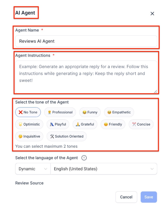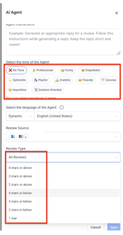 Section titled “Note on AI Behavior and Brand Consistency”One of the biggest advantages of using AI for review responses is the consistency it brings to your customer interactions. However, it’s important to regularly monitor and tweak the AI’s behavior to ensure it remains aligned with your brand’s evolving needs. For example, if your company undergoes a rebranding, adjusting your AI agents’ tone and style will help ensure that their responses stay relevant.
