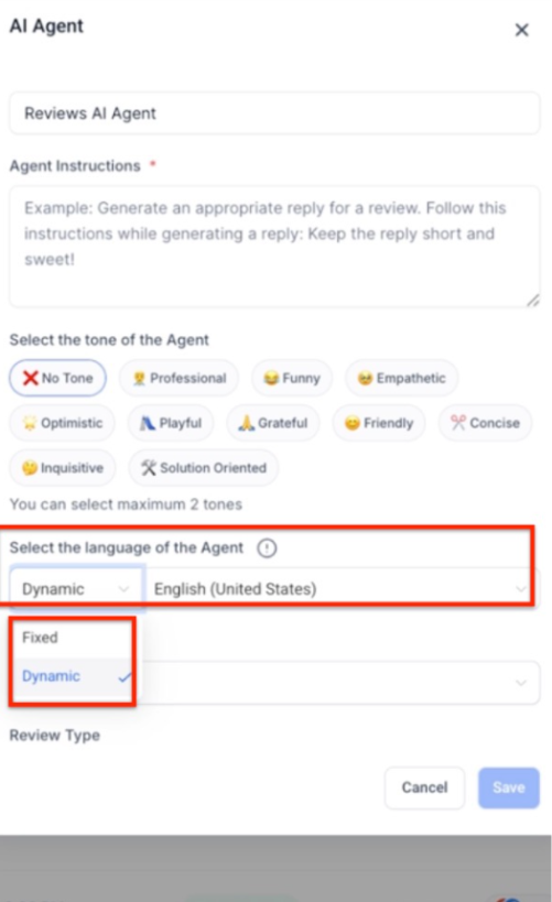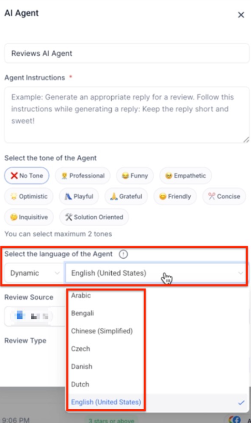 The AI automatically detects the language used in a review, ensuring accurate responses. However, if the language cannot be detected, you can set a fallback language to ensure the AI still responds appropriately.