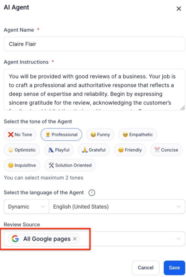 If you’re managing responses for multiple brands or locations, you can assign specific AI agents to different Google Business Pages. This feature helps keep responses organized and tailored to each brand or location.