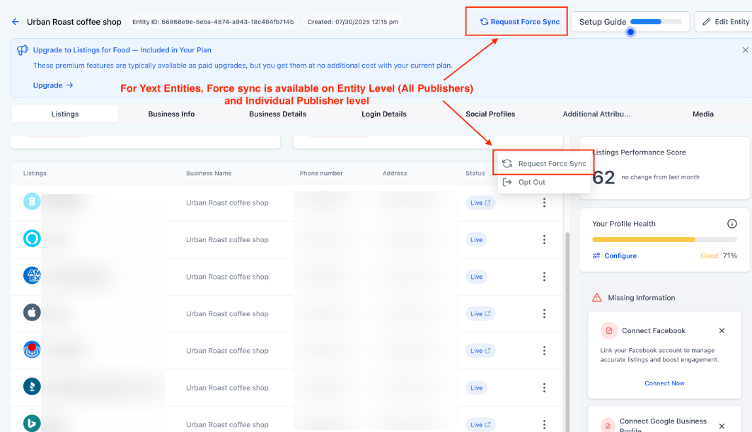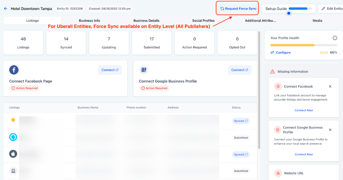 Section titled “How to Use Force Sync”- Access Listings: Navigate to the Listings in the Reputation tab and select the specific business entity you wish to update.