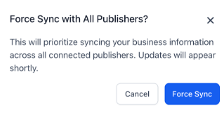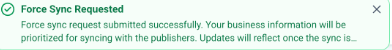 Question: What exactly does the Force Sync feature do? Answer: Force Sync is a manual override that signals the listing engine to prioritize a specific business update. It is designed to push information through the synchronization queue faster than the standard automated process, especially if an update appears to be delayed.