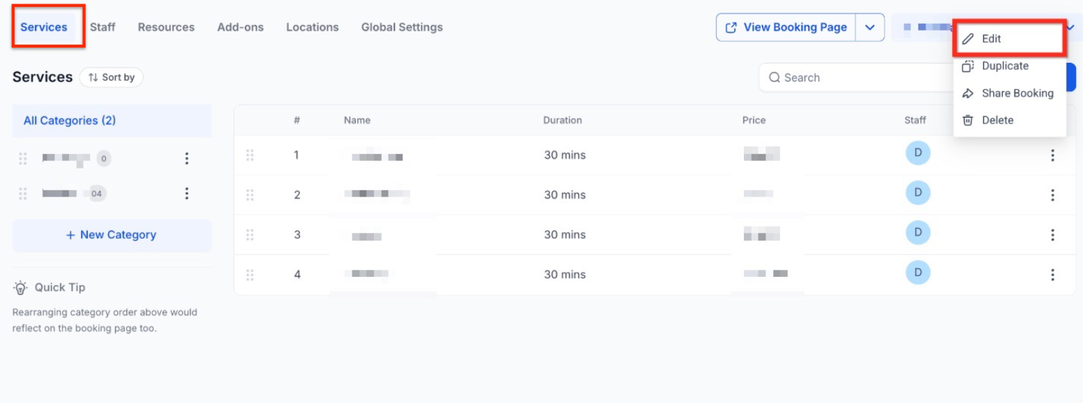 Section titled “How to Edit or Remove an Add-on”1. Go to your Add-ons settings Head over to the Services Panel by clicking on Calendar > Calendar Settings > Services.