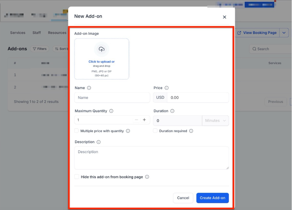 - Visibility: Choose “Hide from Booking Page” if the add-on is for internal staff use only.