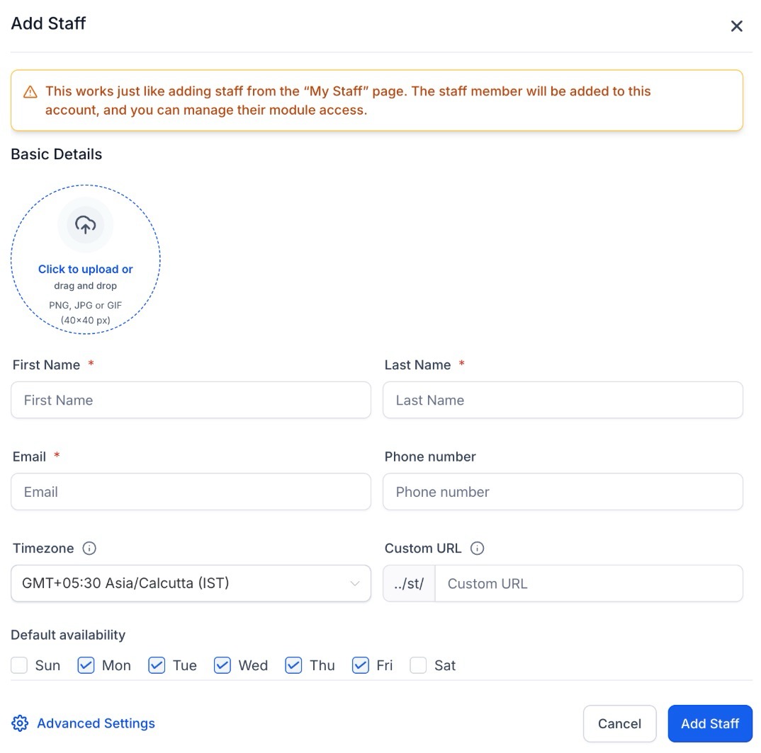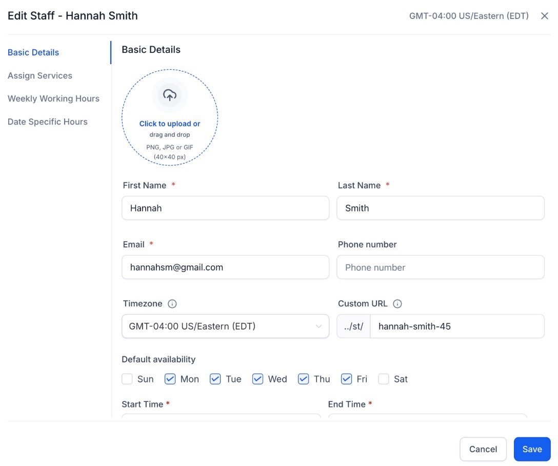 Section titled “Basic Information”- Profile Picture: An image used to represent the staff member on public booking pages.