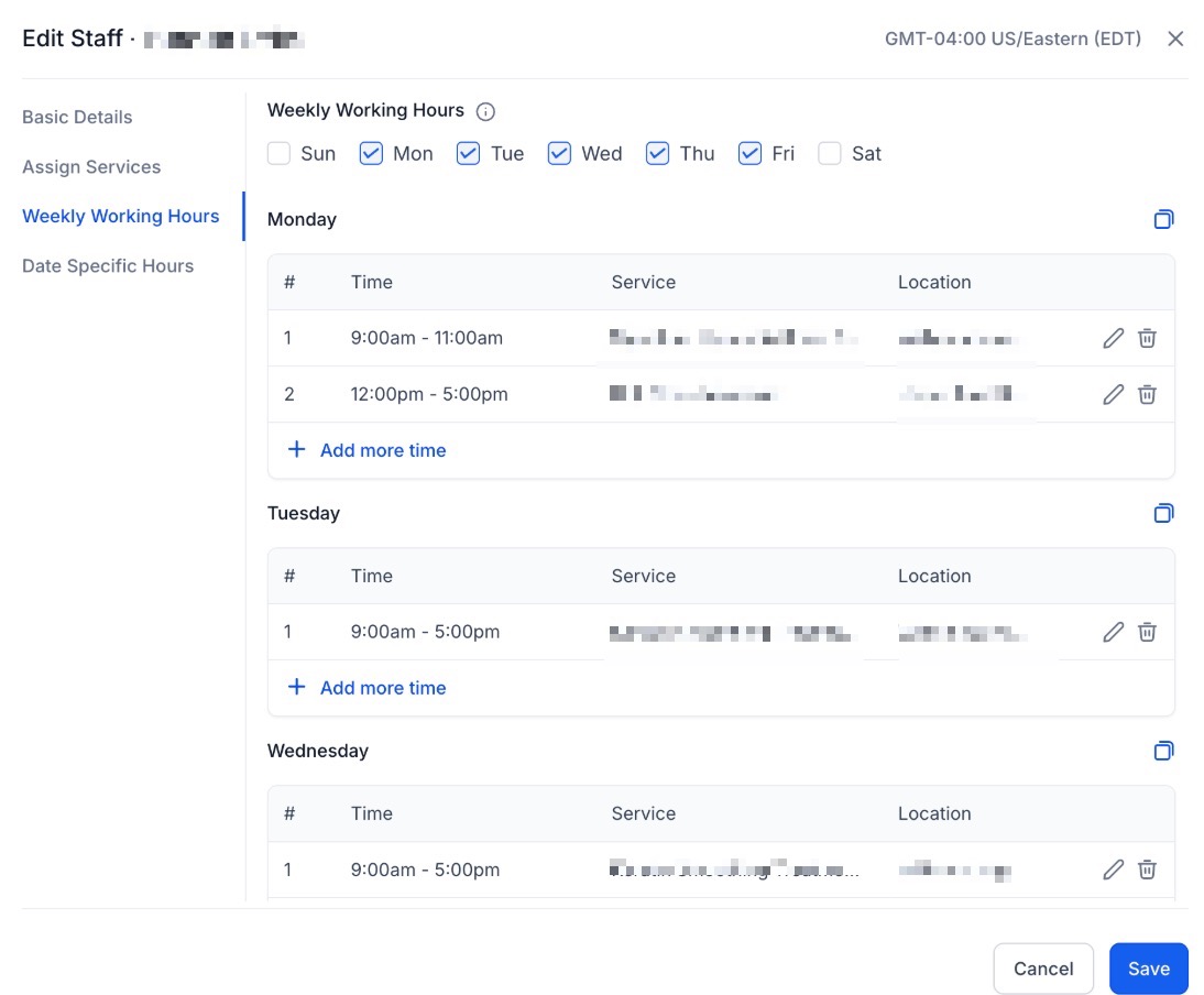 Example: If Hannah is set to a default of Mon–Fri, 9:00 AM – 5:00 PM, those hours apply to every service she offers. If she needs to work a half-day next Tuesday or has shorter hours for a specific premium service, you can easily override the default for those instances.