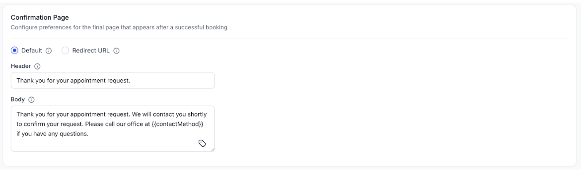 Section titled “Booking page settings for Confirmation Page:”- Custom Message or Redirect: After a booking is completed, you can choose to display a custom message on the default confirmation page or redirect the customer to another page. This allows you to provide additional information or guide them to a relevant next step after their booking is confirmed.