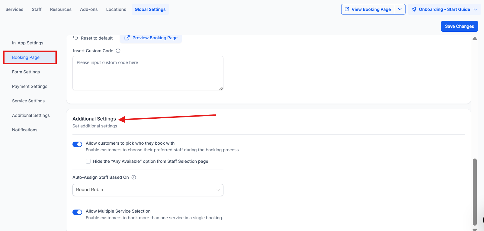 Section titled “Additional Settings within the Booking page settings:”- Allow Customers to Choose a Staff Member: Enable this setting if you want to give customers the option to select their preferred staff member when booking. If disabled, the system will automatically assign a staff member based on availability and round robin logic.