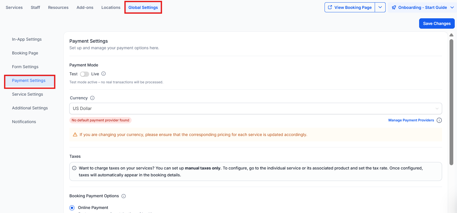 - Booking Payment Options: Set how payments will be handled on the booking page (e.g., pay now or pay in person).