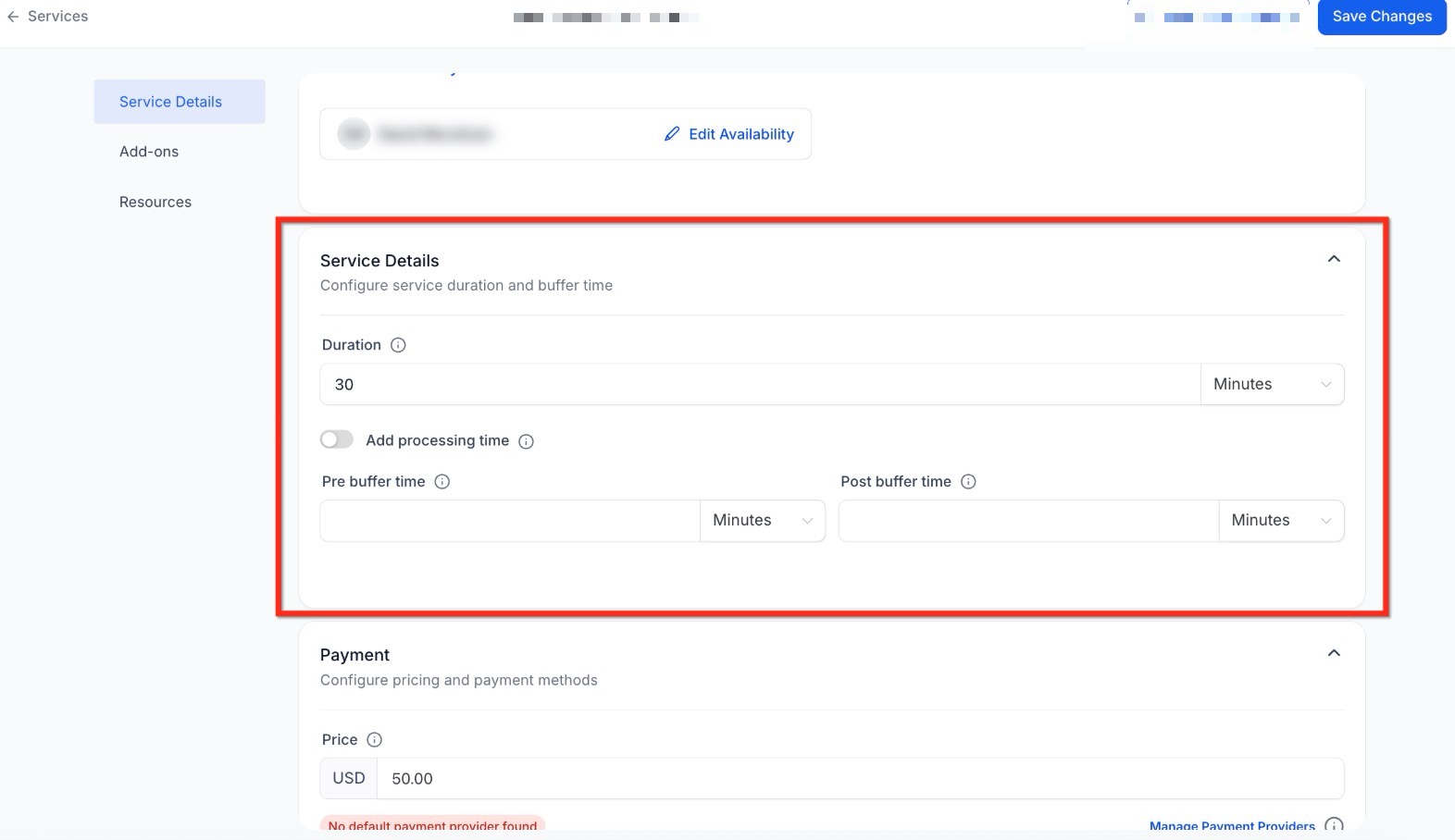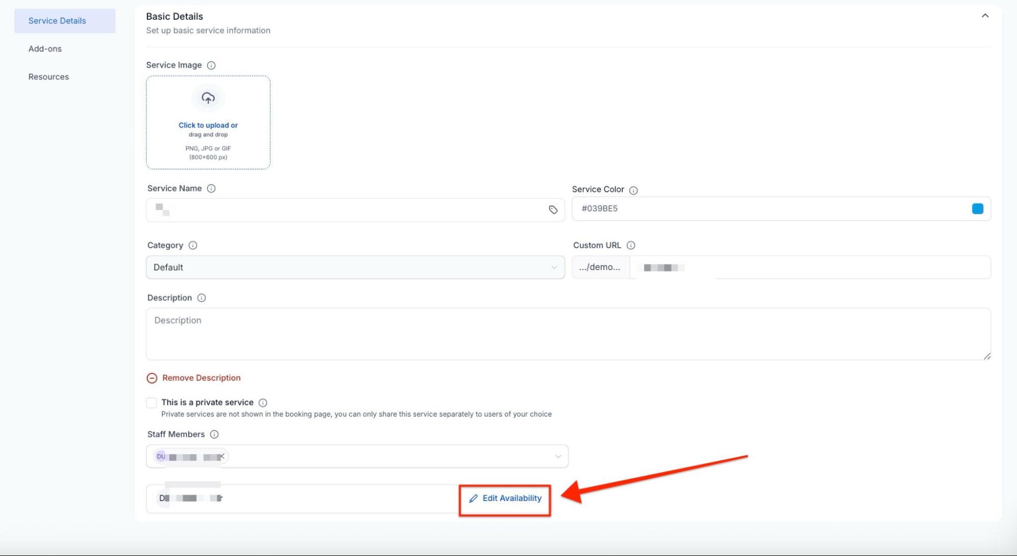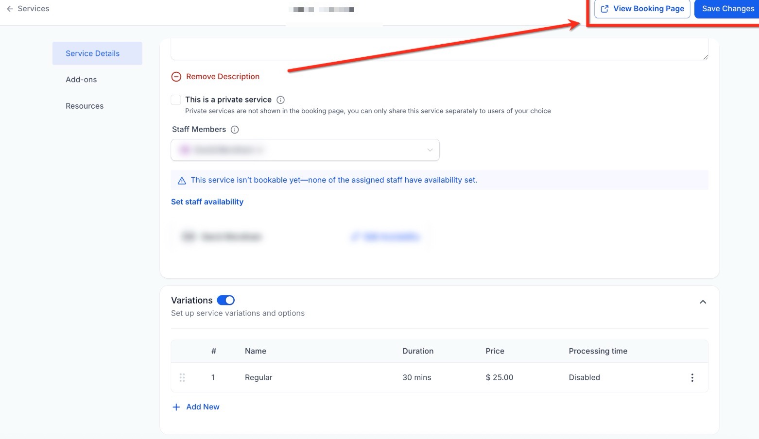 - Service Details: Adjust staff assignments, duration, buffer times, pricing, and payment or deposit settings.