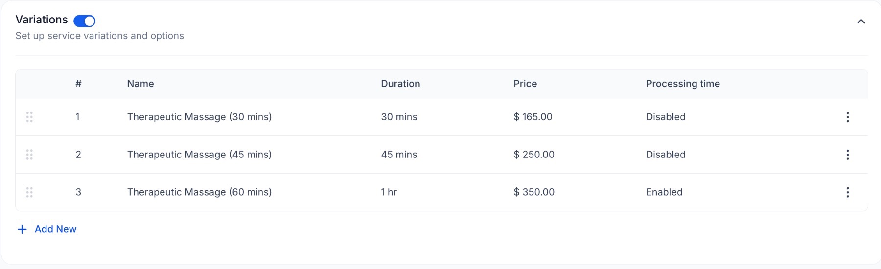 - Variations: Present multiple options, such as different durations or price tiers, within a single service listing.