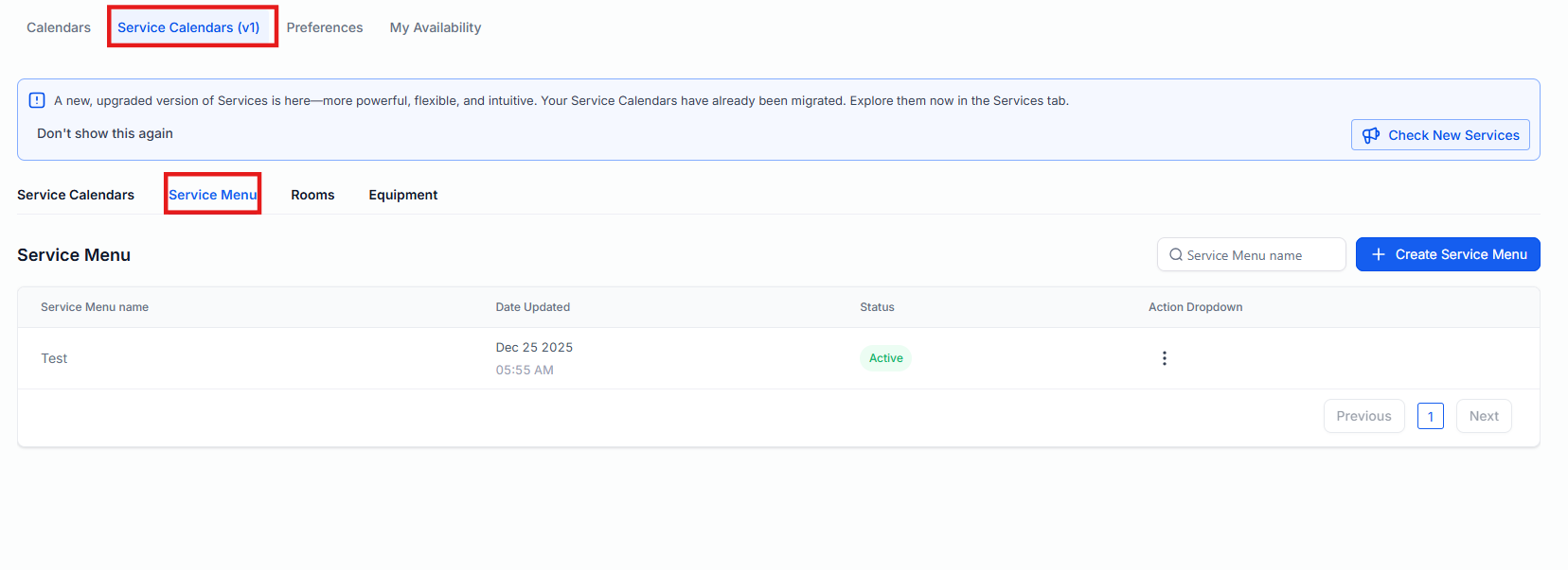 - Click on the Service calendar >** **Service menu tab to view your searchable list of all current offerings.