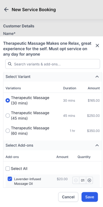 - Service Variants & Add-Ons: Support different durations (e.g., 30 vs. 60 minutes) and include upsells or enhancements with quantity support.