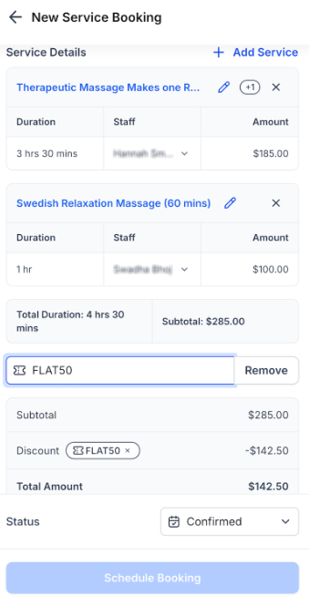 5-Assign Staff: Pick a team member for each service. The pricing will update automatically if staff-specific rates are configured.