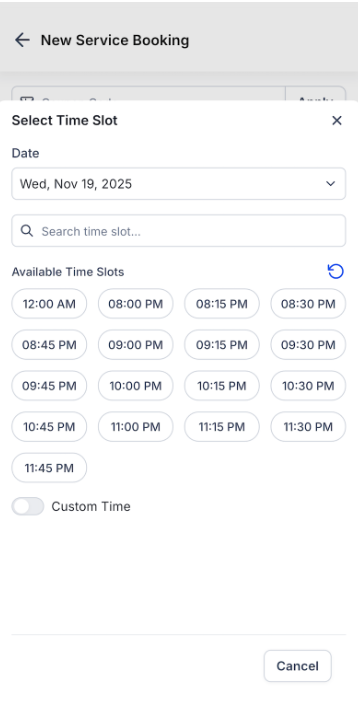 7-Select Time Slot: Choose from the available real-time slots or use a custom time if your permissions allow.