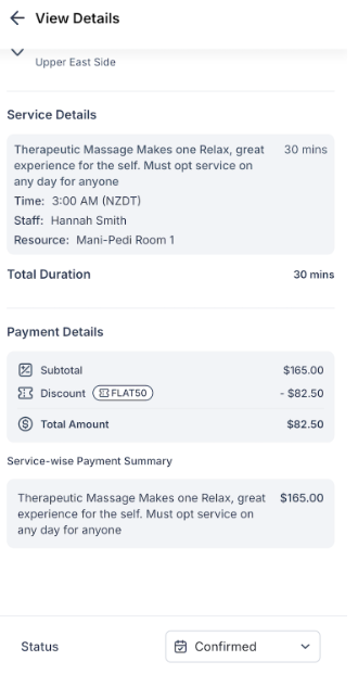 8-Confirm: Review the summary of services, staff, and pricing, then tap Schedule Booking to finalize.