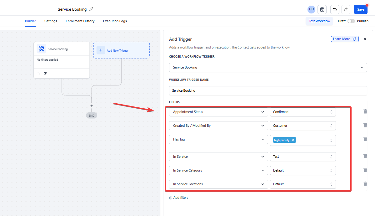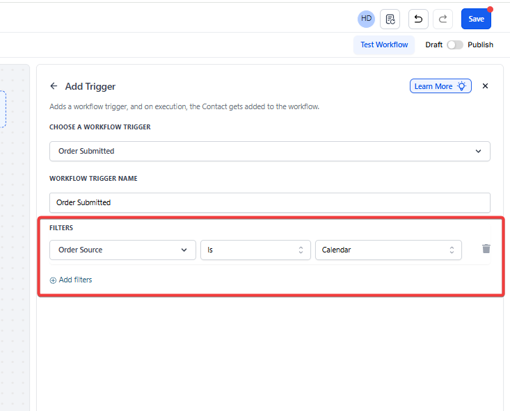 Answer: By default, the Order Submitted trigger ignores service booking orders to avoid duplicates. To include them, you must go to the Order Submitted trigger in your workflow, click on Add Filters, and select the filter Order Source is Calendar.