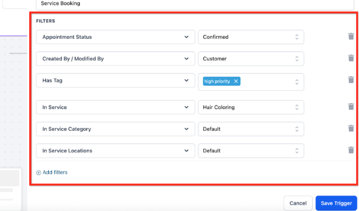 Section titled “Key Features and Benefits”The Service Booking trigger allows you to automate workflows whenever a booking—which may include multiple services or appointments—is created or updated. Unlike standard appointment triggers, this operates at the “main booking” level.