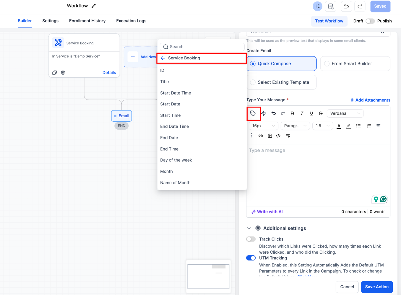 Section titled “Practical Application”Consider a scenario where your workflow is set to “Send Email.” Because the trigger recognizes the entire booking as one event, the client receives a single email summarizing all their scheduled services. To ensure all details appear correctly, make sure you are utilizing the specific Service Booking custom values in your templates.