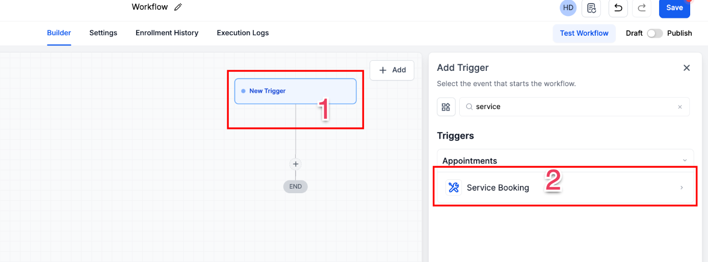 From there, the quickest way to find what you need is to use the search bar, type in, and select the Service Booking trigger to move forward.