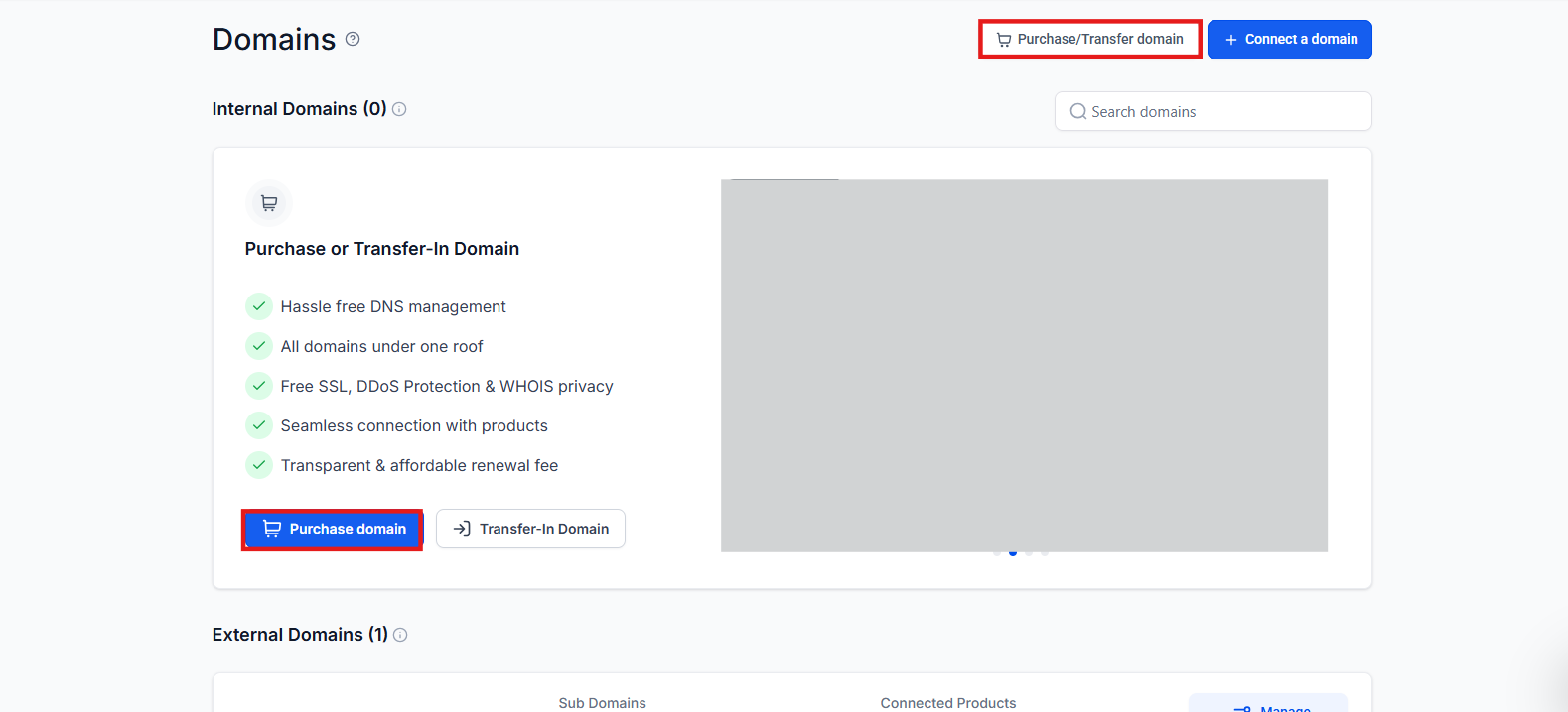 Section titled “Key Features and Benefits”- Centralized Domain Management: Purchase and manage your domains directly from the platform, avoiding the hassle of external services and multiple logins.