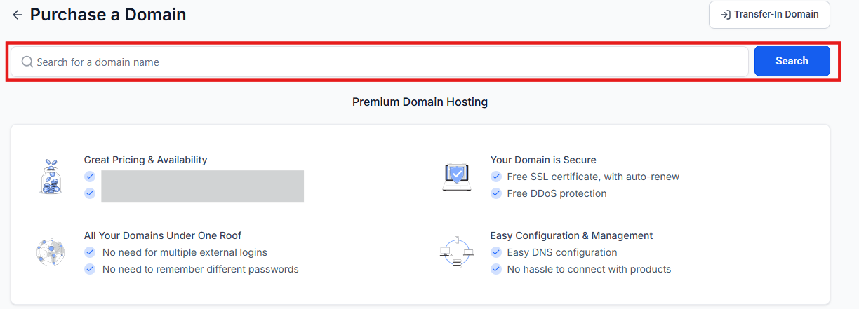 Section titled “Step 2: Check Domain Availability”- Use the search bar to type in the desired domain name.