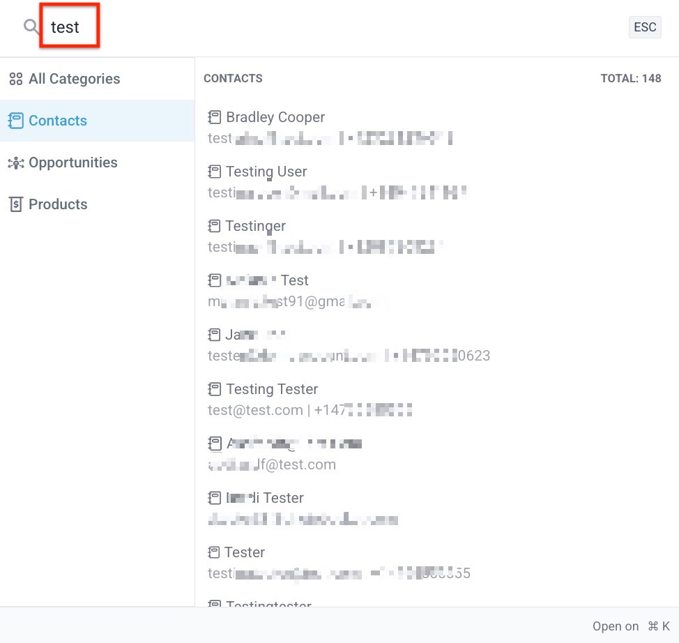 Answer: Yes. For example, if you search for a term like “test,” the system will pull up all matching records. You can then use the left-hand menu to see how many “test” entries exist specifically under Contacts, Opportunities, or Payments.
