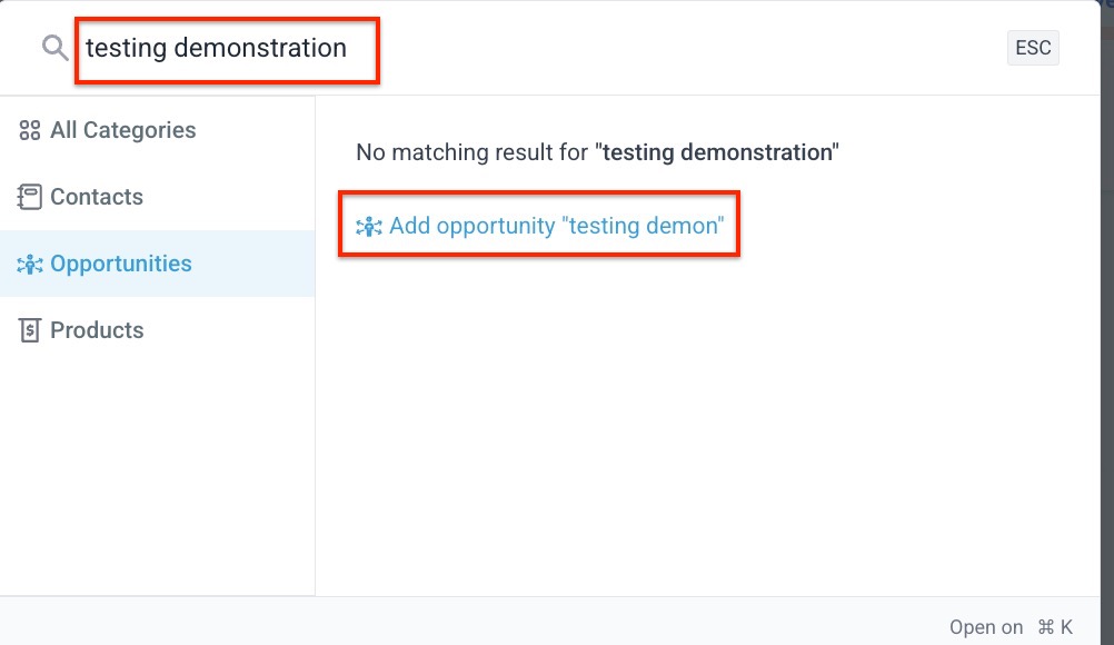 Section titled “Step 2: Add a Contact or Opportunity from the Search tab”- In both the Contacts and Opportunities tabs, if your search doesn’t yield a result, you can create a new contact or opportunity right from here.