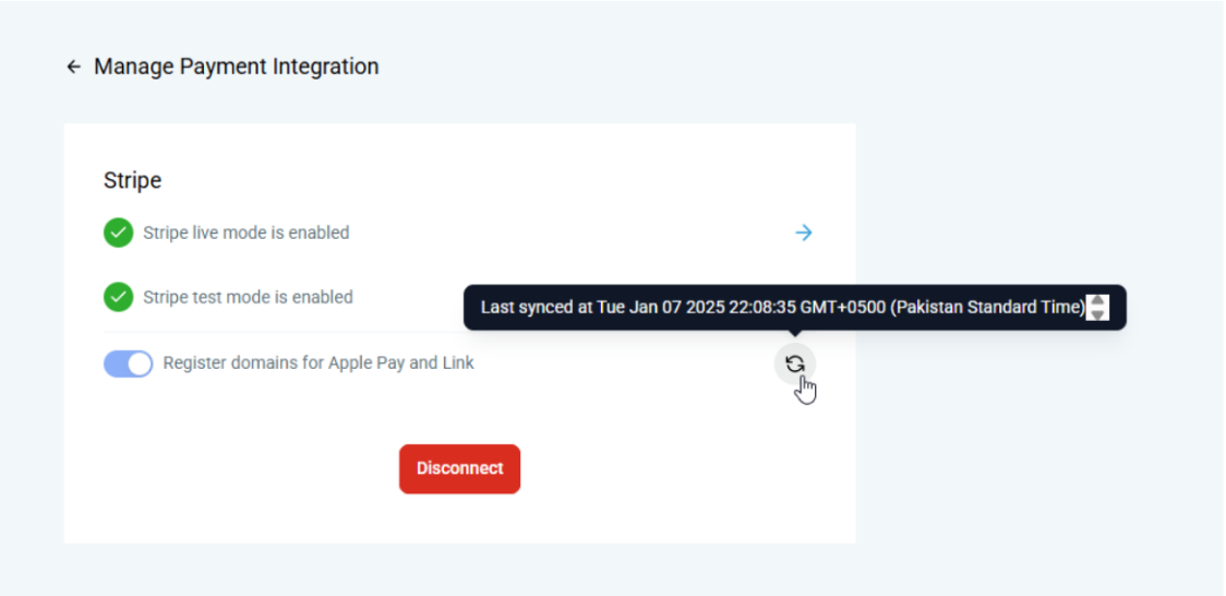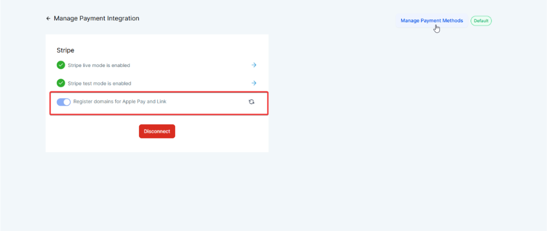 Section titled “Pro Tips”- Regular Checks: Regularly check your Stripe integration settings to ensure the “Register domains for Apple Pay” toggle is enabled.