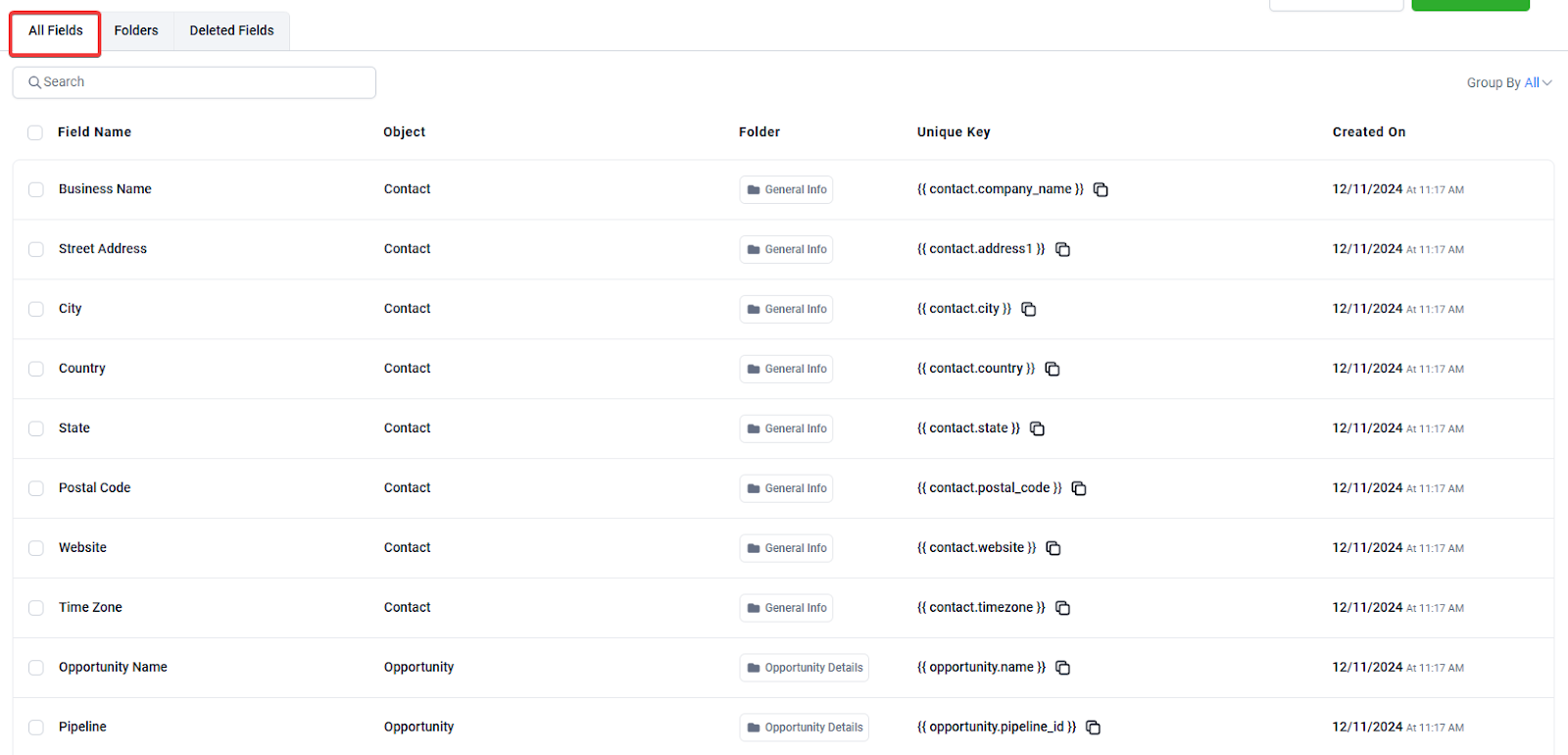 Section titled “Step 1: Create Custom Fields”- Navigate to Settings on the bottom left >Select Custom Fields from the settings menu on the left>Click on All Fields on the top right