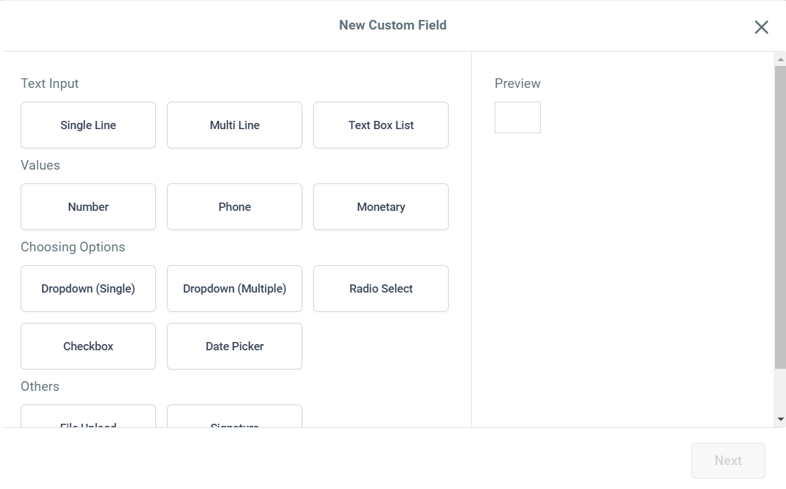 In the Pop-up, you will have options for what kind of custom field you want to create