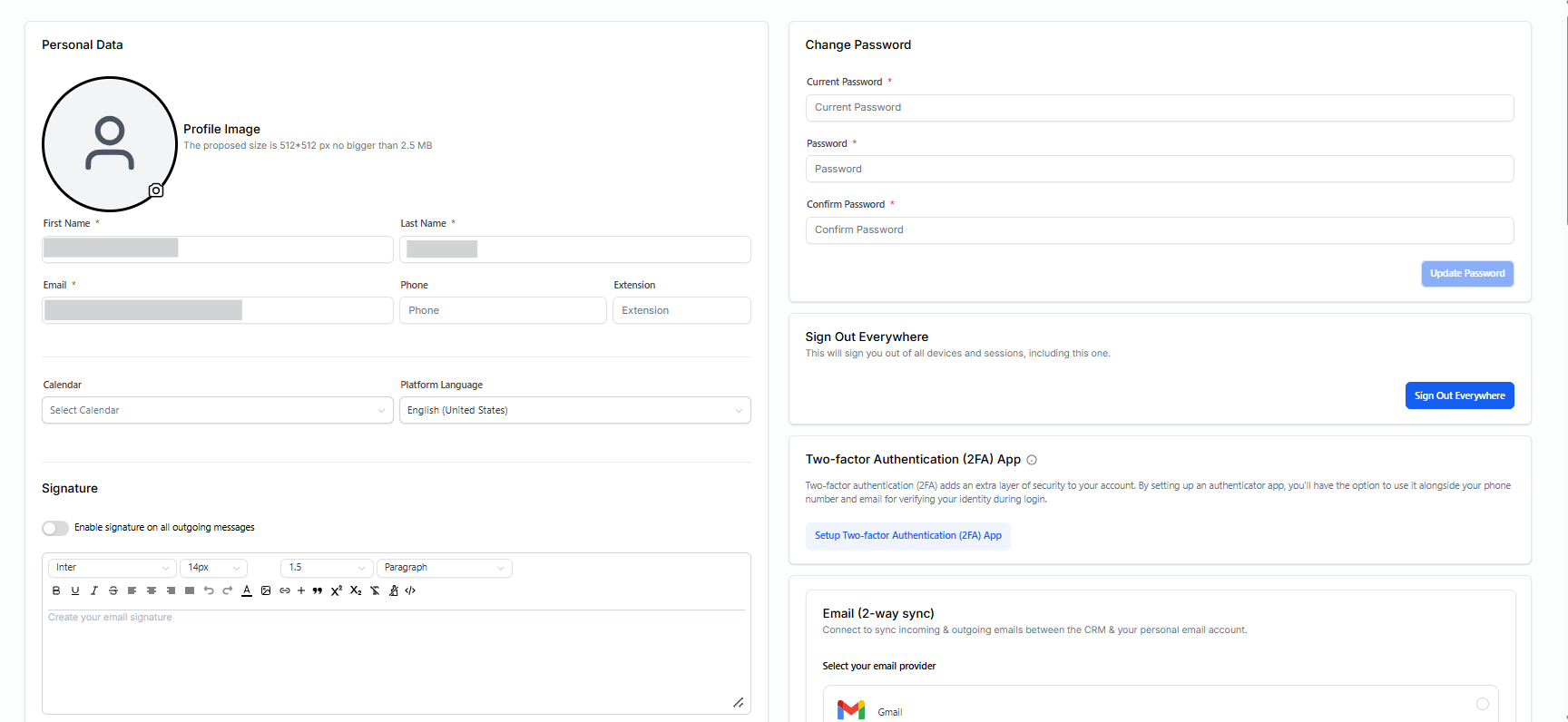 Personal Data: First and last name, email, phone, calendar, platform language, signature