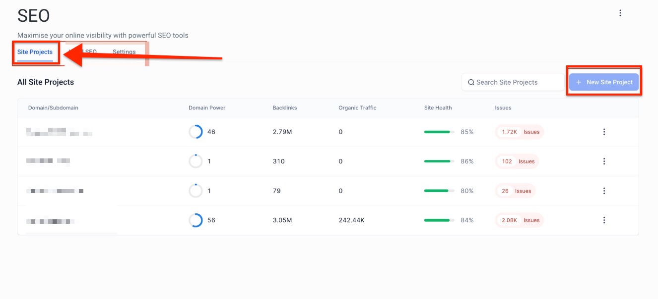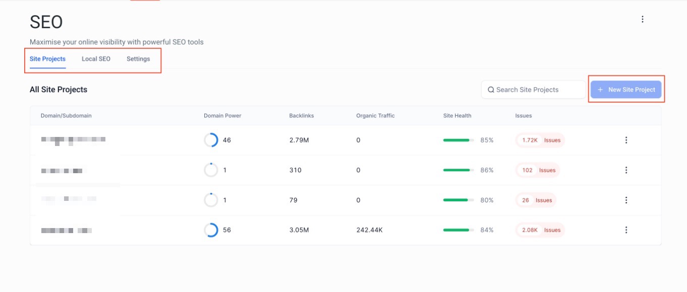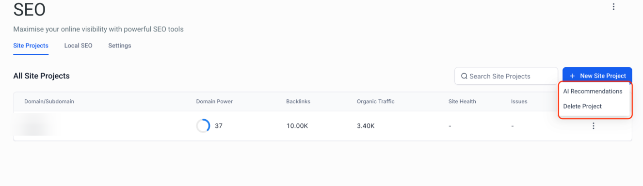 Log in to your and navigate to Sites > SEO. Here you will see the primary tabs: Site Projects (for domain monitoring), Local SEO (for Google Maps rankings), and Settings (for quota tracking).