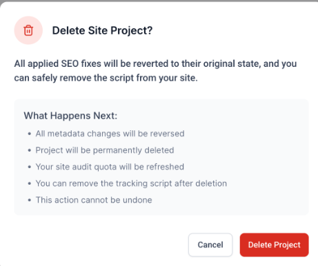 Question: What happens to my site if I delete an SEO Site Project? Answer: Deleting a project restores your quota so you can add a new site, but it also rolls back any automated fixes (like meta tags or image alt text) that were applied through the tool.