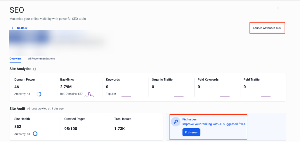 For in-depth analysis and content planning, click the “Launch Advanced SEO” button. This opens an expanded toolkit in a new window for advanced reporting and content strategy.