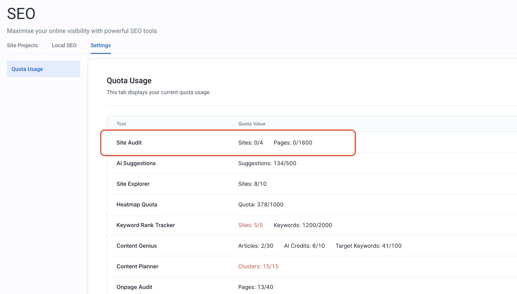 Answer: You can monitor your current capacity and available slots at any time by navigating to the Settings tab within the SEO menu and selecting Quota Info.