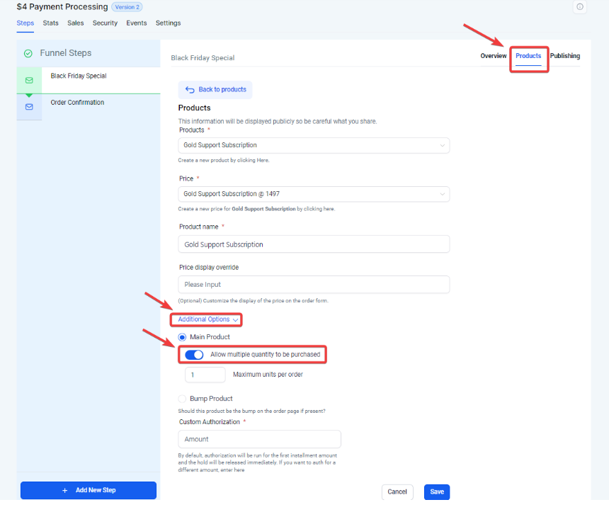 - Customizable Quantity Limits: Set a maximum order quantity per product, ranging from 1 to 999, directly on the funnel product page.