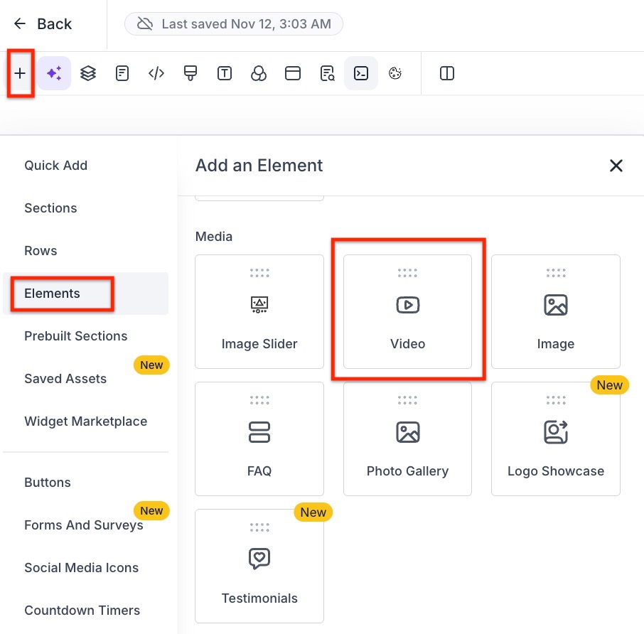 - Click on the plus sign icon at the top left to add elements.