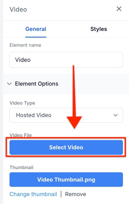 Section titled “Add the Video to the Element”- Click on Select Video to be taken to your Media Storage. (If you do not already have the video that you need, upload it to the Media Storage)