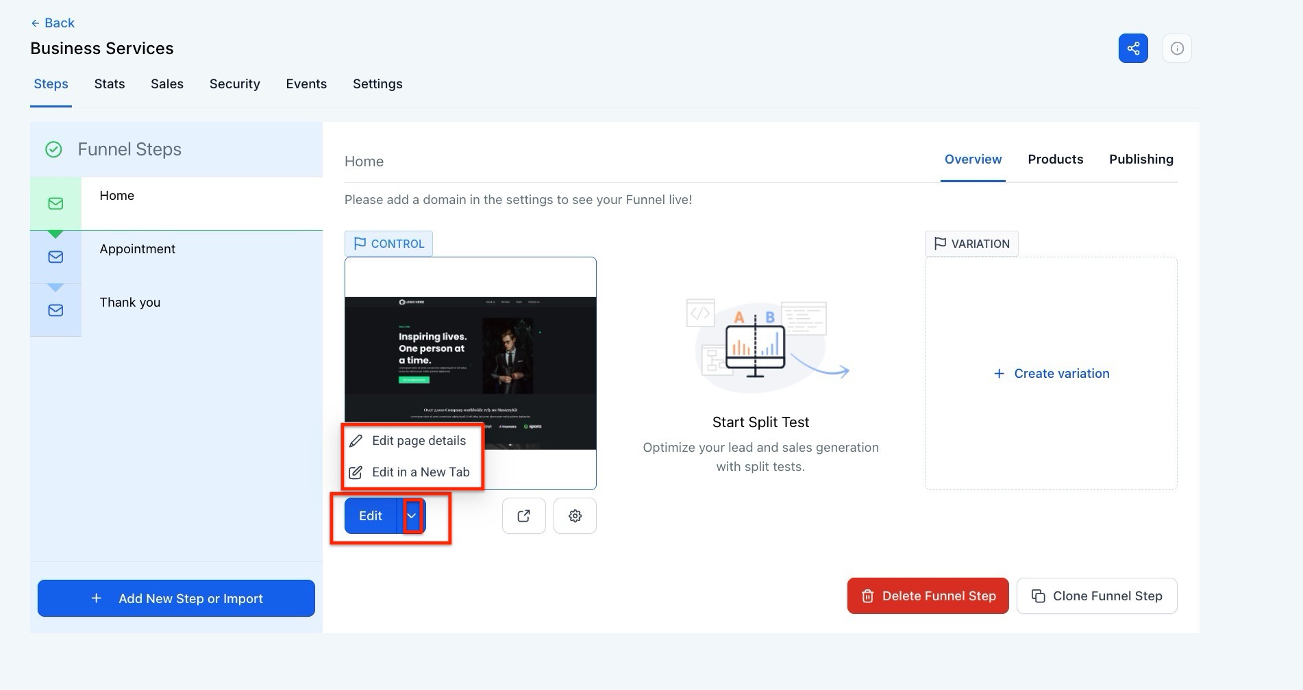 Step 1: Navigate to Sites and choose a Funnel or Website.