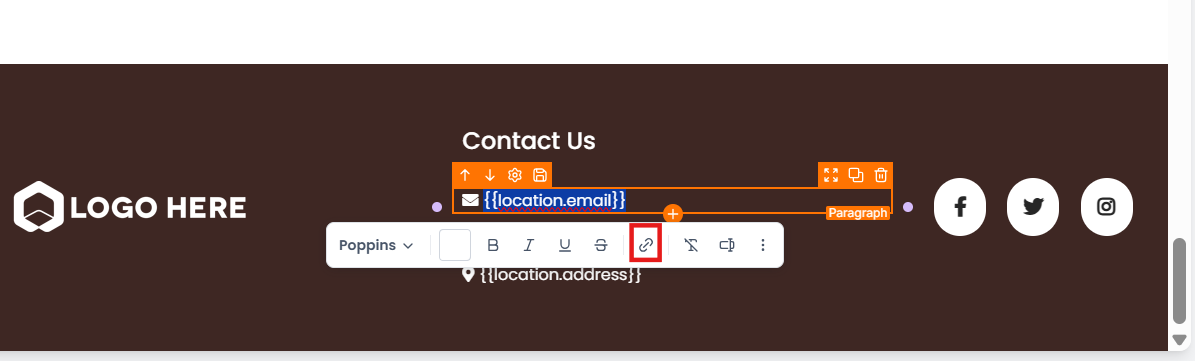 Step 3: In the builder, click to highlight the text you wish to create a hyperlink for. A small menu will appear at the top of the screen. Click the hyperlink logo, and a pop-up window will appear.