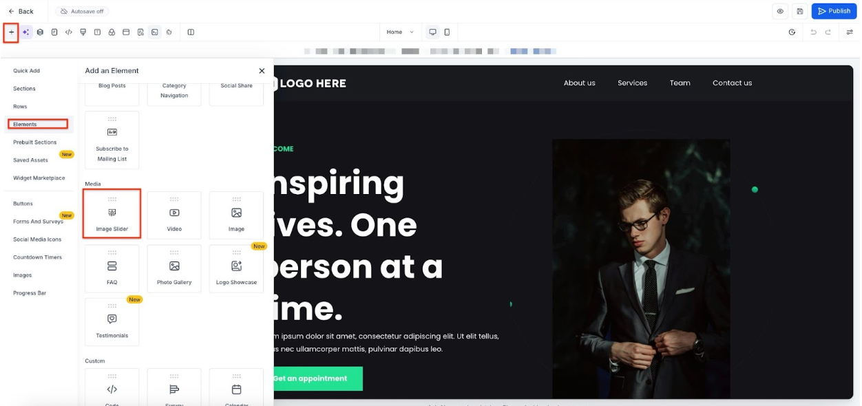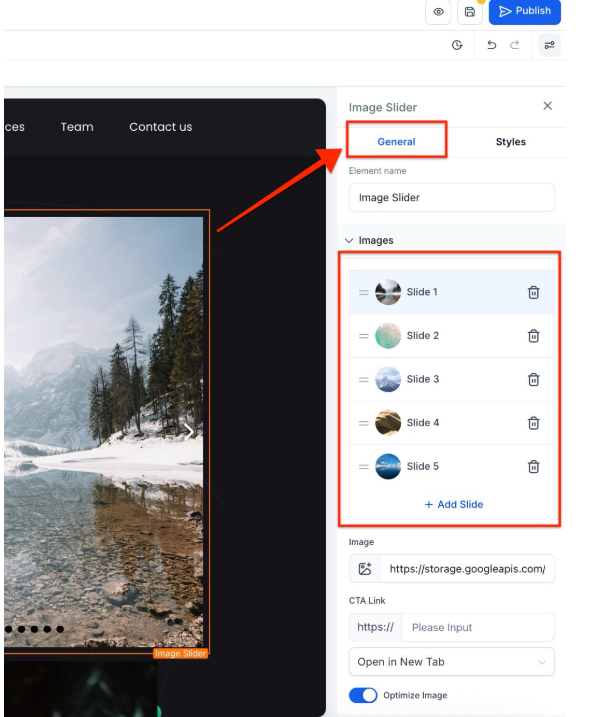Implementation: Navigate to the section where you wish to add the image slider. Scroll down the menu on the left side until you find the image slider option. A simple click will implement it.