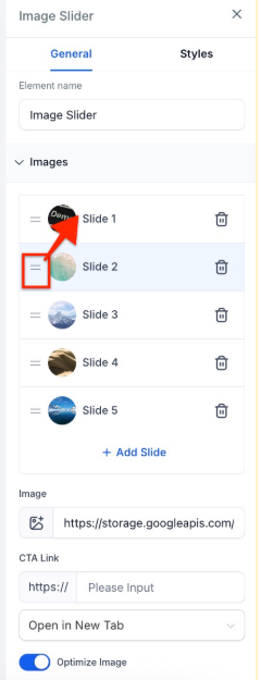 Section titled “Question: How can I add an image slider to my website or funnel?”Answer: Within the builder, navigate to the desired section or page, drag and drop the “Image Slider” element, customize as needed, add images, and save the changes.
