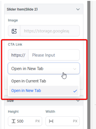 Section titled “Advanced Features for a Tailored Experience”Additional Slides and Call-To-Action (CTA): gives you the flexibility to add more slides. Additionally, for each slide, there’s an option to insert a CTA link, specifying the URL visitors will be directed to upon clicking the image. You can even determine if the link should open in the same or a new tab