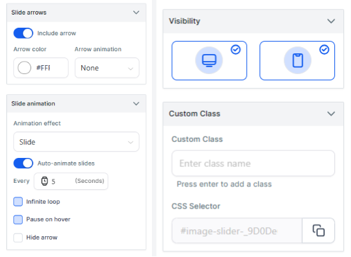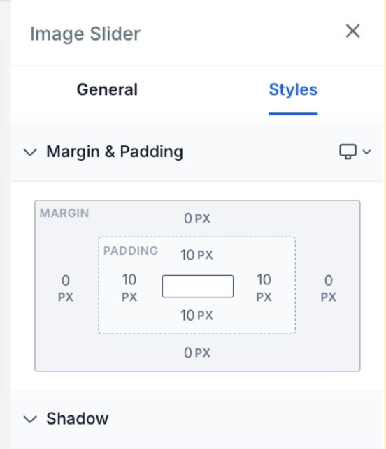 Section titled “Question: Are there any other new elements introduced alongside the Image Slider?”Answer: Yes, we’ve also introduced the Margin Padding, Shadow, Custom Class, and Visibility elements for enhanced design and customization.