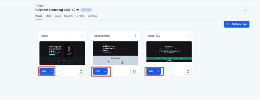 Section titled “Step 2: Edit Your Landing Page”- Find the specific funnel or website to which you wish to apply URL parameters. Click the “Edit” button for the page you want to modify.