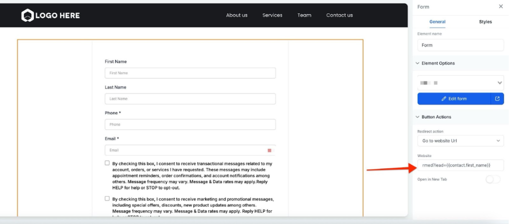 Section titled “Step 5 (Option 2): Redirect to this URL from the previous step in this funnel”- You can add the link with the URL parameters to the previous step of the funnel using the redirect options for the button/form/survey/calendar.